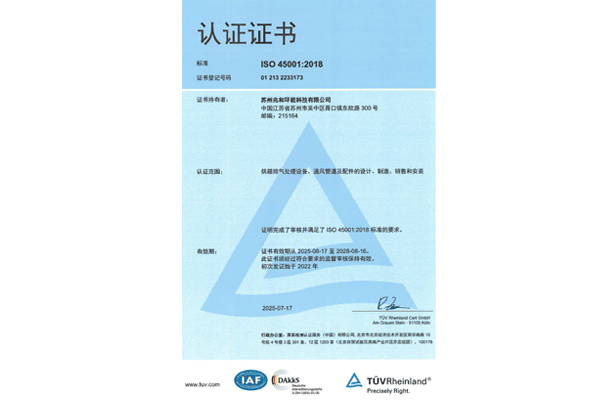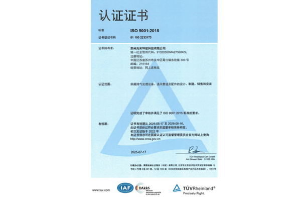 苏州兆和环能科技有限公司是一家工业生产环境空气系统综合服务商。公司先后获得了多项国际国内认证,2022 年 8 月入选 “2022 年度姑苏创新创业领军人才计划”、2023 年 6 月获评 “中国隐形独角兽企业” 称号、2023年12 月被认定为 “苏州市级企业技术中心”、2024 年还顺利通过 RBA-VAP 审核并取得银牌。莱茵认证质量管理体系、机电安装一级等证书。